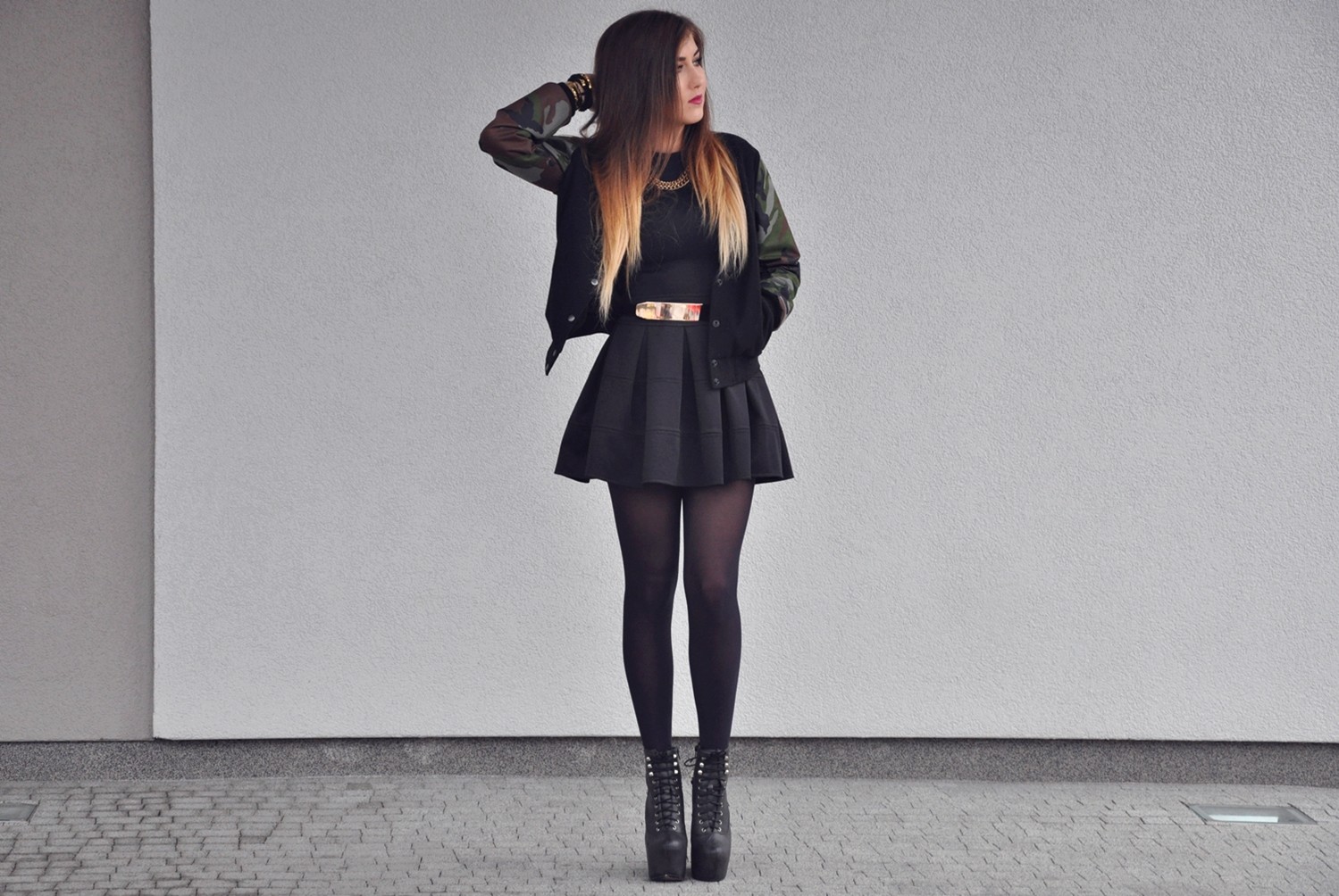 Moro powoli odchodzi do lamusa? Nie dla mnie. Czarna kurtka z tym motywem prezentuje się świetnie i stała się jedną z moich ulubionych. Nie ma co przesadzać wtrącając kolor do stylizacji, czerń i złoto same się obronią. Na pierwszy rzut oka można powiedzieć, że ubogo ale taki był zamiar. Bardzo lubię łączyć damski styl ze stylem męskim. Uwielbiam eksperymentować nosić potężne buty przez łagodne szpilki po trampki, tak na prawdę czuję się świetnie we wszystkim. Ciężko by było żyć w klatce nosząc tylko ciuchy z danego rodzaju. Pamiętam czasy, kiedy słowa "wysoki obcas" mnie przerażały i praktycznie dla mnie nie istniały. Zakładając 4 cm szpilki na wesele myślałam, że tego nie przeżyję, nogi mi się wykręcały na każda stronę, a teraz? Nie wyobrażam sobie życia bez high heels :) Buty Jeffrey Campbell model "Damsel Cross", które mają aż 18 cm wysokości okazały się bardzo wygodne i stabilne! Jednym słowem czułam się kobieco, wygodnie i na luzie.